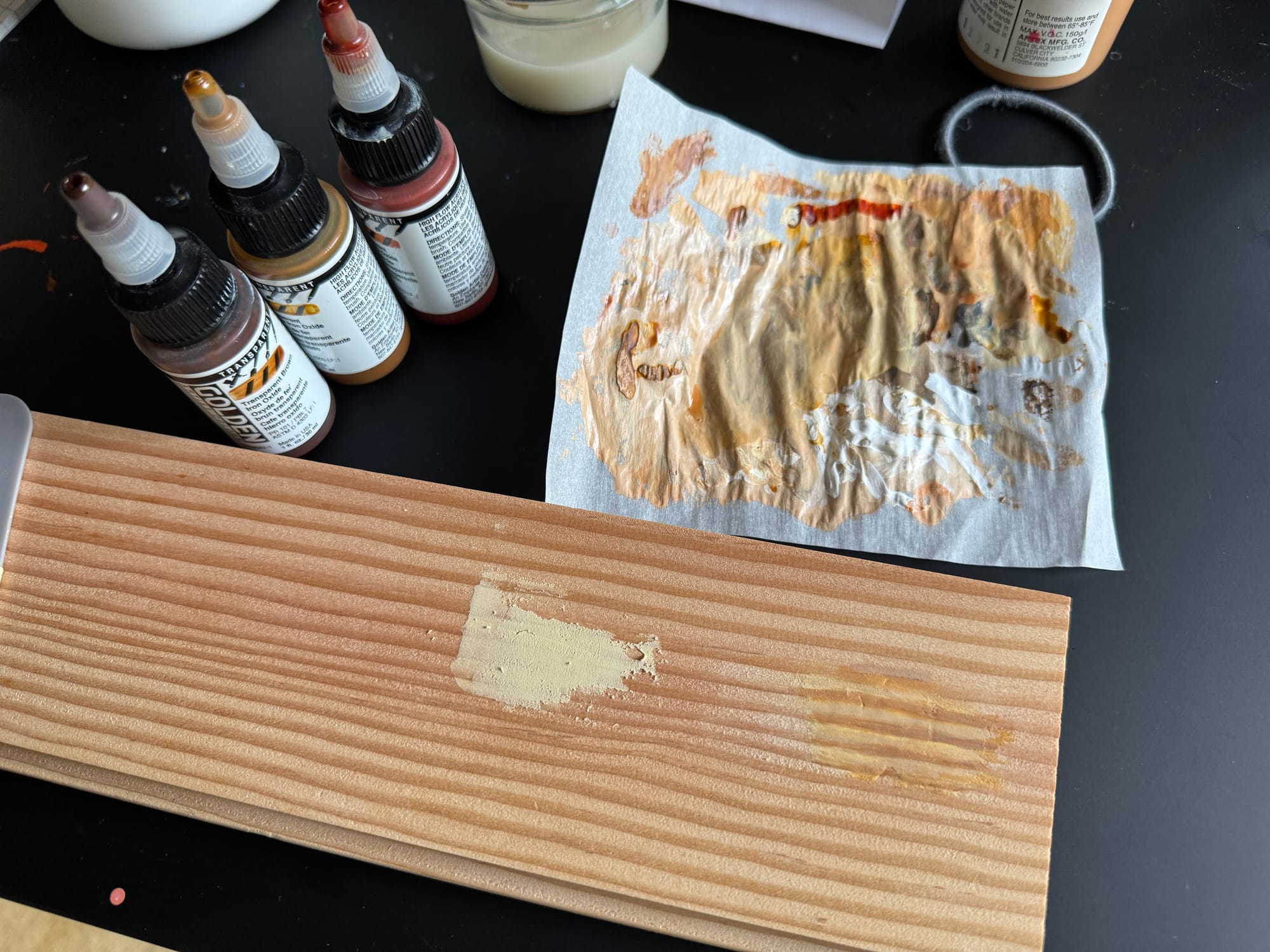 Here's some practice that I did. We put two smears of filler (that light stuff) on a cutoff piece of board. The one on the left I left for reference, the one on the right I tried to color with paint. It's not perfect, but it was just practice.