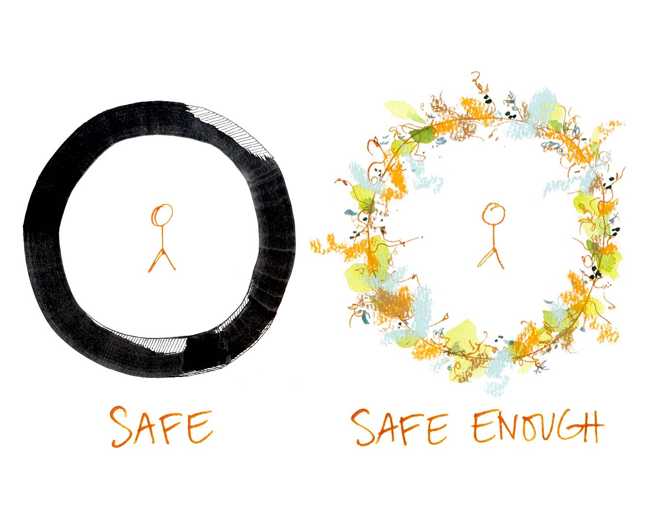 I've realized my sketchbook is a really safe sandbox to encounter these difficult feelings. They show up strong, not realizing how little is at stake here. But I know we're safe, so I can welcome them at their full strength. I can hear how afraid they are of ruining things. I hear their reasons: they think that if I am bad at this, if I let myself be bad at things in general, then people will make fun of me and I will be ostracized and overlooked and seen as incompetent and then I won't be able to make enough money to take care of myself and I'll die. No wonder it's a strong feeling: to this 'perfectionist' part of me, this is life and death stuff.