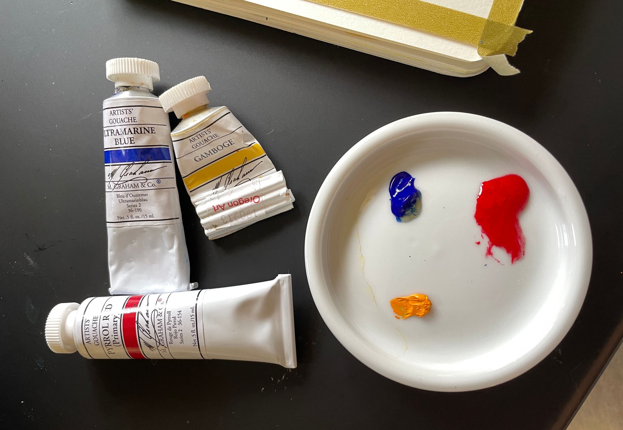 Here's my first palette. I'm using Pyrrole Red, Ultramarine Blue and Gamboge gouache.