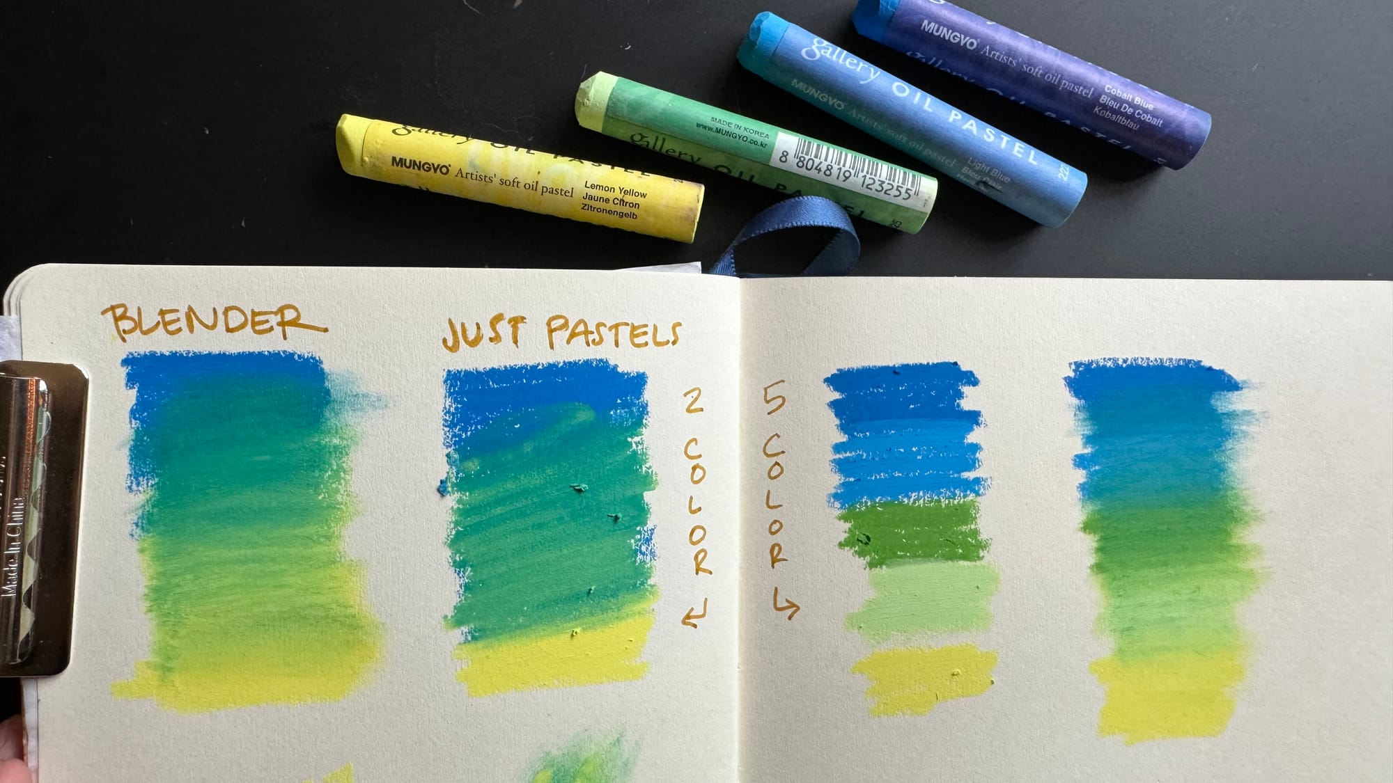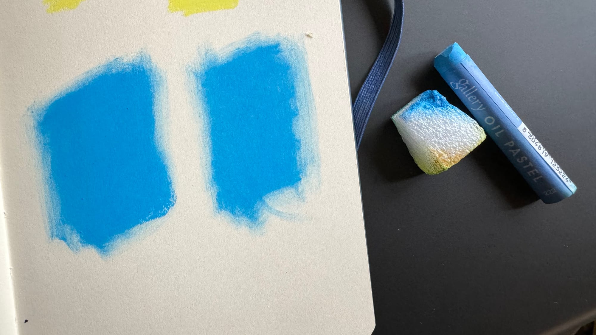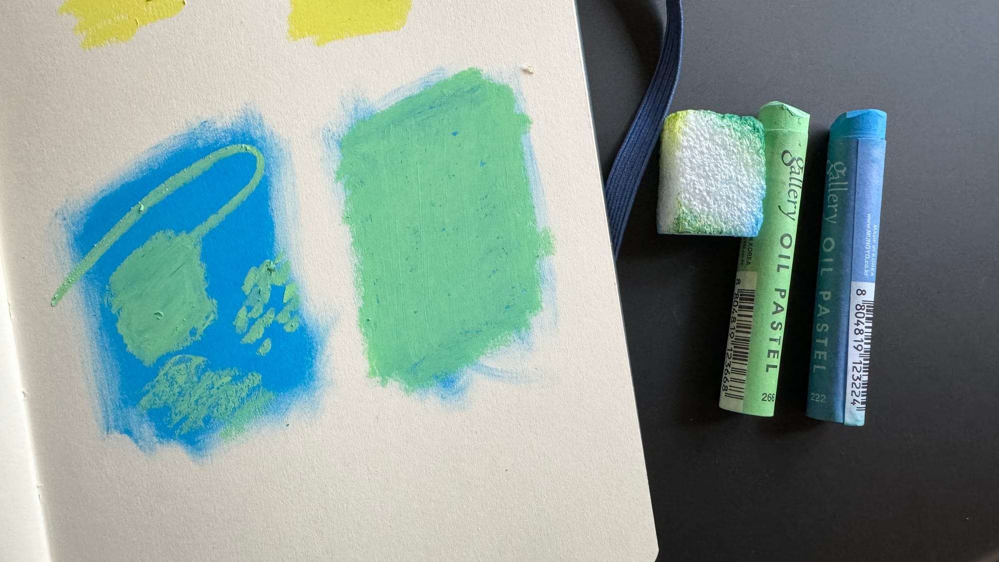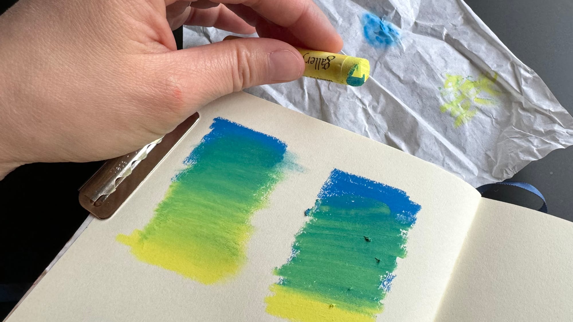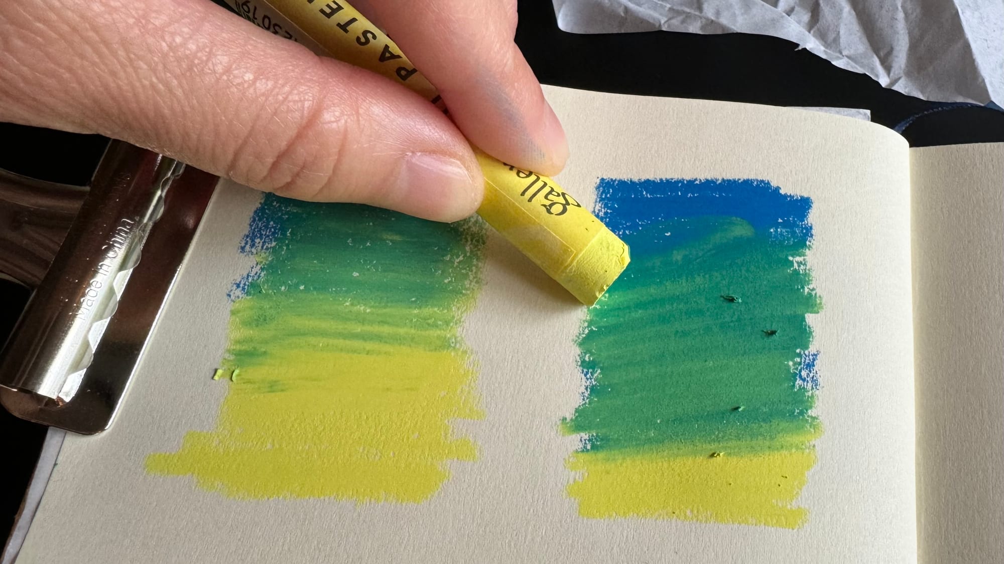 Another way to blend pastels is to use heavy pressure to directly blend one oil pastel into another. Below, on the left, I made yellow and blue gradients on top of each other, blue from the top and yellow from below, and then blended it in. On the right side I put down the blue first and then scrubbed the yellow into it.