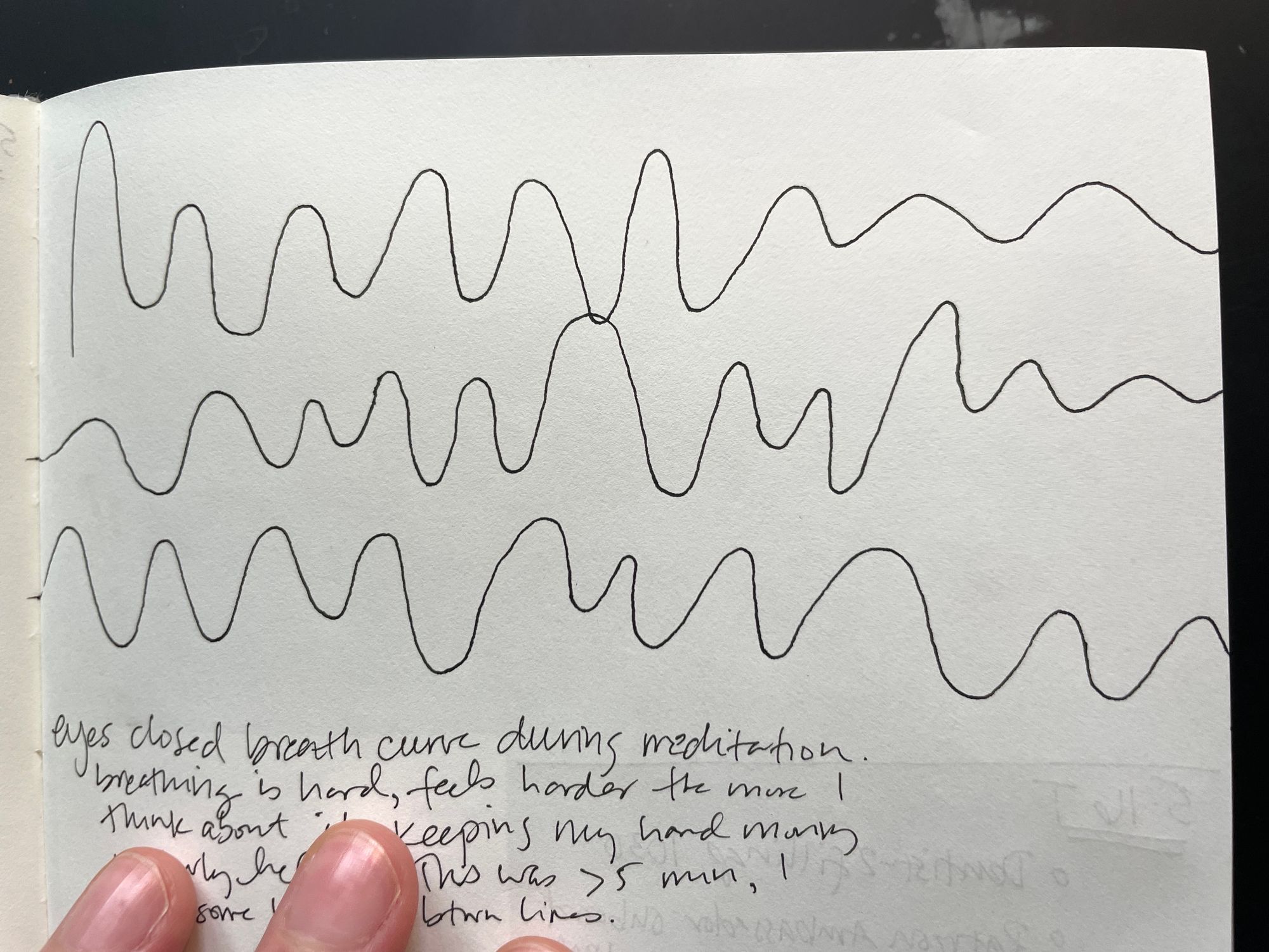 1) The breath line. I close my eyes, put my pen on the page and draw upward on the inhale and downward on the exhale. I try to imagine that my breath is moving the pen. Sometimes I move my pen faster or slower, or draw shorter or longer curves – whatever feels like a natural expression of my breathing. Here are some from the other night.